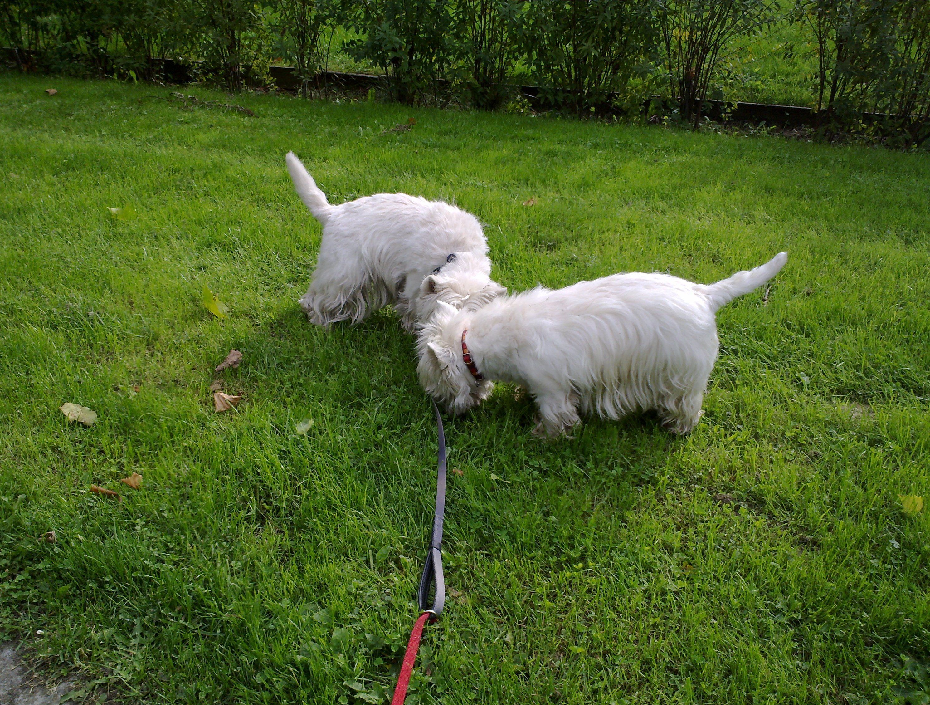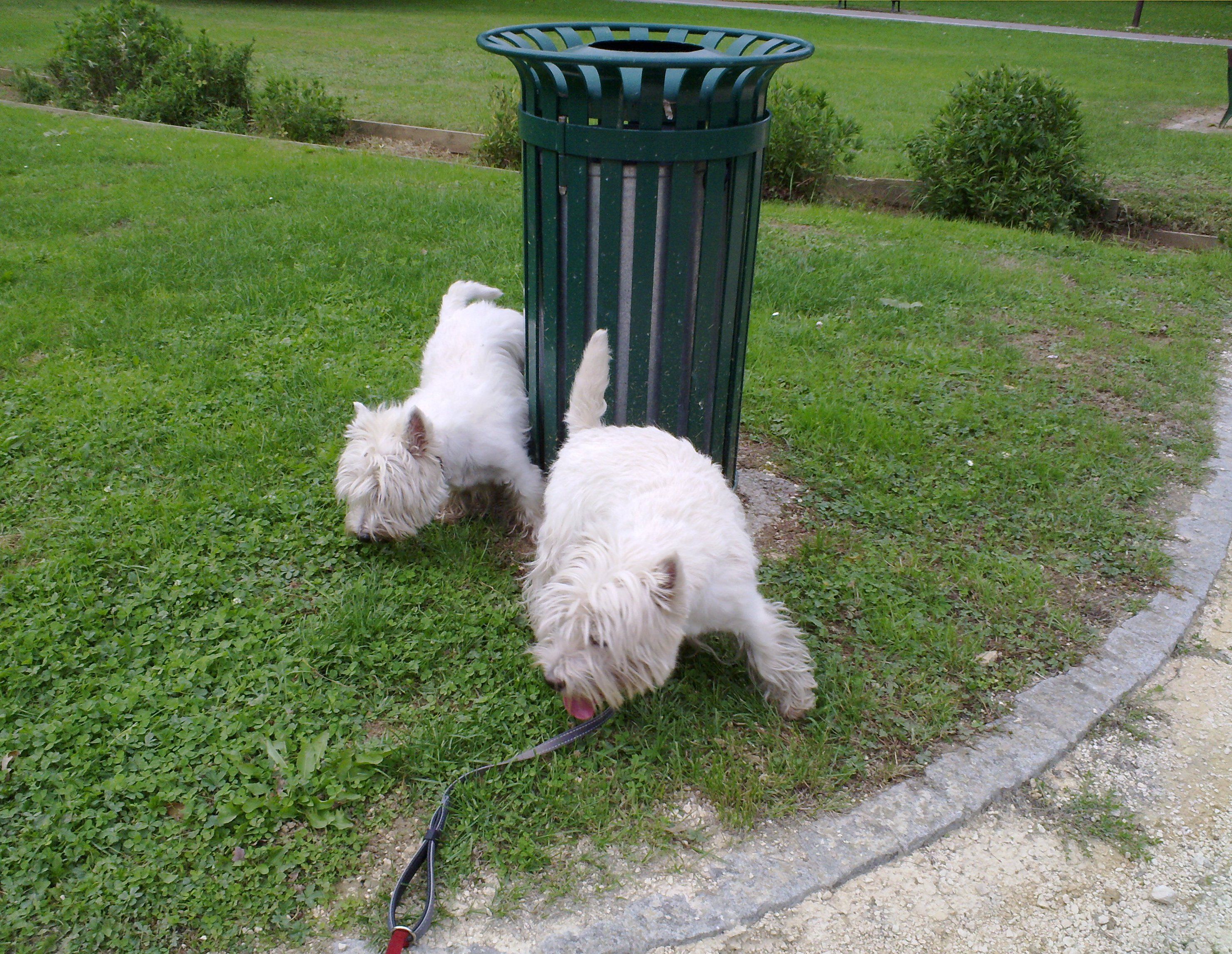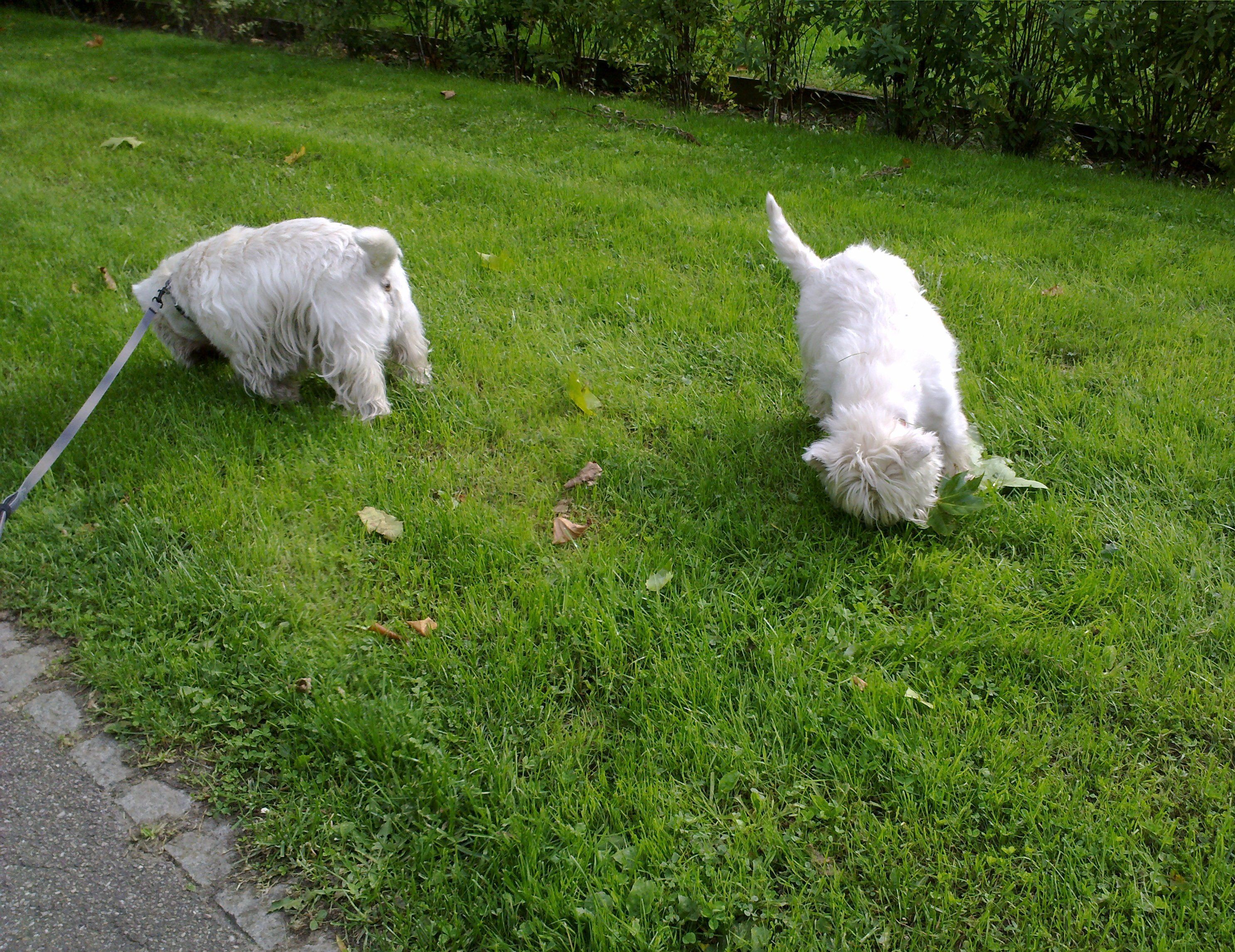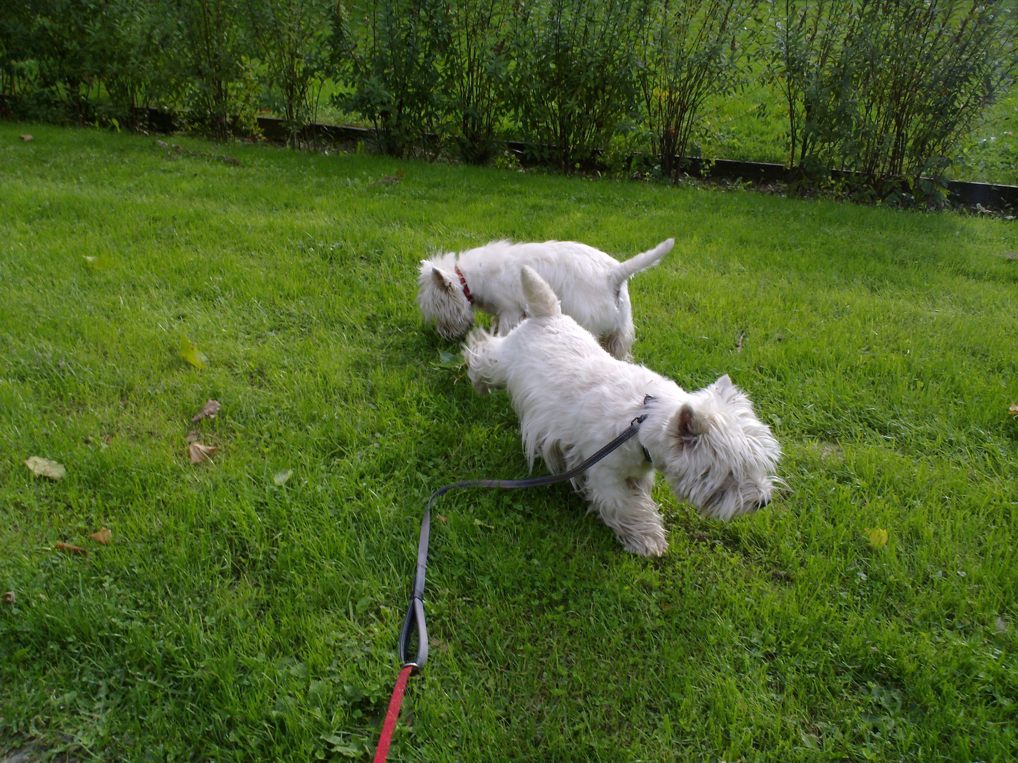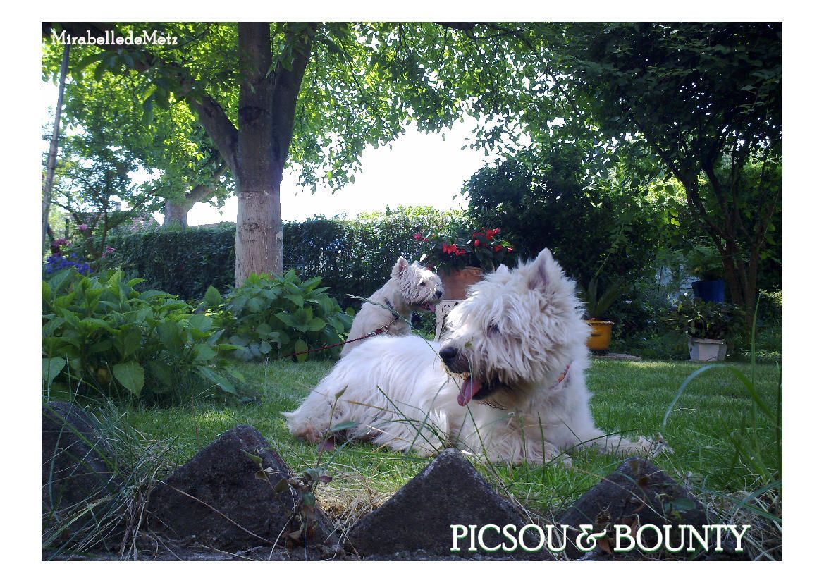 PICSOU & BOUNTY tous deux la truffe collée à la verdure.